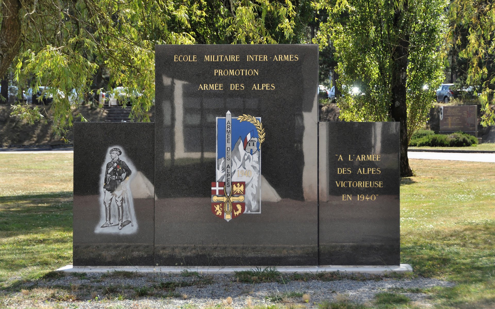 La Stèle “ A L’ARMEE DES ALPES VICTORIEUSE EN 1940 ” se trouve à l’Ouest du dernier peigne, sur la pelouse devant l’ancienne infirmerie “Elèves”. elle a été inaugurée à la fin de la scolarité de la promotion Armée des Alpes, en juin 2021.